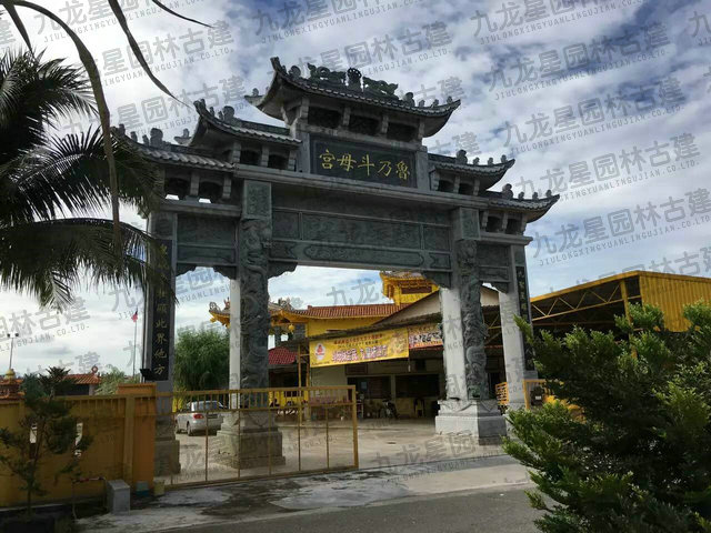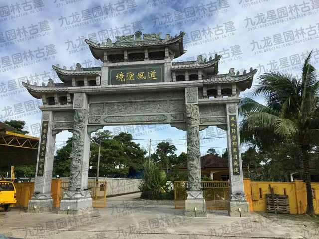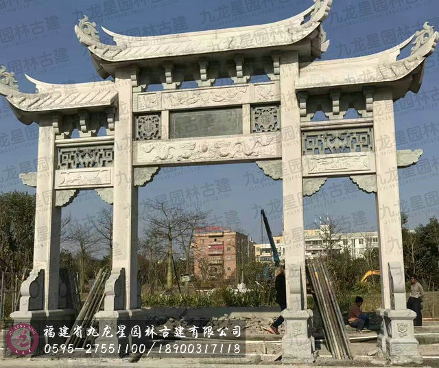 牌坊集中了中國古建筑最有特征的構件組成,有臺座、柱身(包括夾桿石)、梁坊、樓匾、斗拱、樓頂等構件。石造牌坊材質堅固敦實牢靠,且可仿照木結構造型。在藝術處理上,可以在夾桿石、柱子、額坊等處,雕刻各式各樣的花鳥、圖案、龍鳳及各種瑞獸等等,將中國傳統的石刻藝術集中于一身表現出來。中國民俗專家講:“石雕不開光是石雕工藝品,開光后就是具有靈氣的風水神器?!彼浴胺菍庫o無以致遠,非精誠無以神明?!?石牌坊是用石修建的牌坊,是一種裝飾建筑物。柱石的上方刻有麒麟、獅子,夾柱石的浮雕有雙獅戲彩珠,牌坊上還雕刻著其他怪獸云紋。兩側基石柱各有撐鼓,石柱兩側配有石獅。牌坊運用浮雕、透雕等手法,是我國建筑藝術的一大特色。
