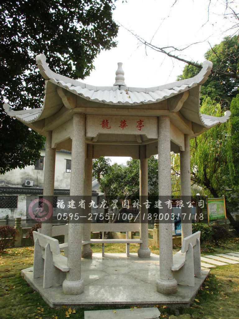 石雕涼亭是指用石頭加工而成的亭子,多建于路旁,供行人休息、乘涼或觀景用。石雕涼亭體量小,平面嚴(yán)謹(jǐn)。自點狀傘亭起,由簡樸而龐大,根本上都是規(guī)矩多少形體,或再加以組合變形,沒有圍墻。