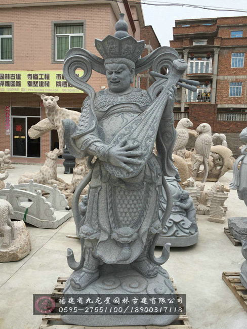 石雕東方持國天王.名多羅托,身著白色,穿甲胄,手持琵琶琴。用琵琶彈奏,使之缽依佛門,以音樂感化眾生護(hù)持國土。其職責(zé)是:保護(hù)東方國土,保護(hù)眾生,保護(hù)東方弗提婆洲人民。