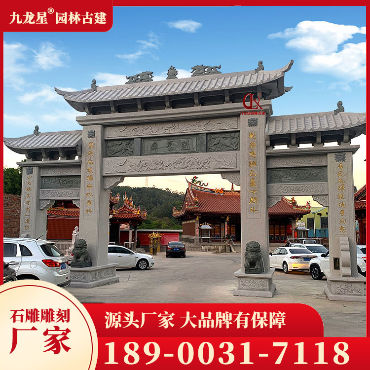 寺廟石牌坊的造型豐富多樣,有單間式、雙間式、多間式等多種形式。其中,單間式石牌坊簡潔明了,適合用于小型寺廟;雙間式石牌坊則莊重大氣,適用于大型寺廟;多間式石牌坊則更加復雜精致,通常是作為主殿前的重要建筑。此外,寺廟石牌坊的造型還受到地域文化的影響,如福建的漳州南山寺石牌坊、浙江的普陀山南海觀音禪寺石牌坊等,都具有鮮明的地方特色。