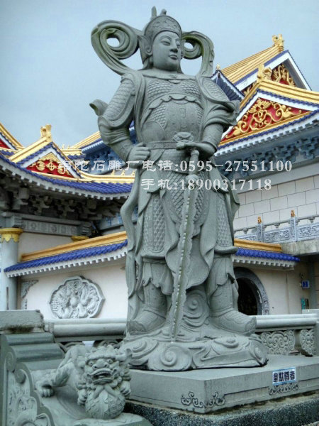 韋馱菩薩像常威武地立于最靠近寺院門口的四天王殿內(nèi),面向寺院,以守護道場。其形像大多為身穿甲胄的雄壯武將,手持金剛杵,或以杵柱地,或雙手合十,將杵擱于肘間。韋馱菩薩現(xiàn)天大將軍身擔當佛教中驅(qū)除邪魔,保護佛法的重任,為佛教中護法金剛力士的代表之一.